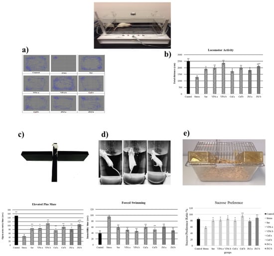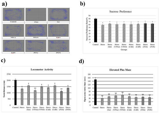 The sucrose preference test, with the consumption of sucrose in water is shown in Figure 3e. The average sucrose consumption ratio in the control group was 85%, while the Stress group showed a significant decrease to 58% (p < 0.05). The treatment with Ser, VPA a-b, and Cef a-b significantly increased the sucrose consumption ratio compared with the Stress group to 80, 82–86, 80–95 (p < 0.05), respectively.