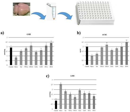 In the Stress group, the levels of GSH in brain tissues significantly decreased to 0.8 µmol/mg compared with the control group (1.9 µmol/mg) (p < 0.05). In the case of positive control groups, only the highest concentration of VPA (VPAb group, 2.1 µmol/mg) and Cef (Cefb group, 1.6 µmol/mg) significantly increased the GSH level compared with the Stress group. The treatment with JNJ significantly increased the GSH levels compared with the Stress group to 2.1 µmol/mg in the JNJa group and 2.4 µmol/mg in the JNJb group (p < 0.001). There is no significant difference between JNJ groups (p > 0.05) (Figure 5a).