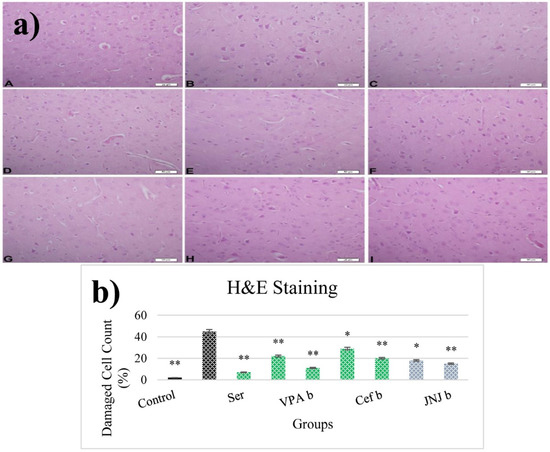 (a) H&E images of experimental groups. Histopathological images of A (Control), B (Stress), C (Ser), D (VPAa), E (VPAb), F (Cefa), G(Cefb), H (JNJa), and I (JNJb). (b) The number of damaged cells is given as a percentage after quantitative determination. * p < 0.05, ** p < 0.001 compared with the Stress group.