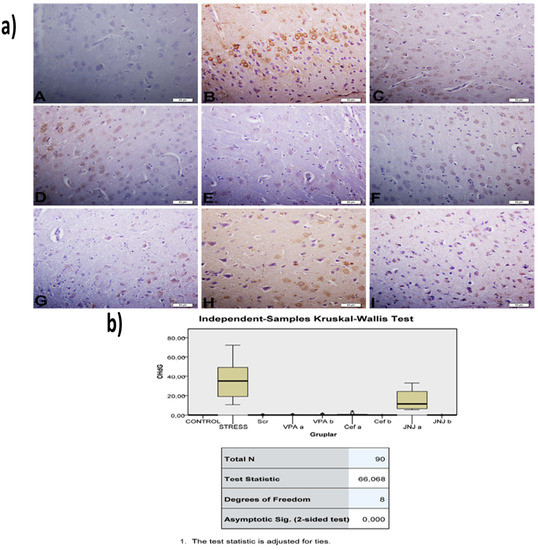 (a) 8-OHdG images of experimental groups. Histopathological images of A (Control), B (Stress), C (Ser), D (VPAa), E (VPAb), F (Cefa), G(Cefb), H (JNJa), and I (JNJb). IHC-P—immunohistochemistry-paraffin protocol. (b) Quantitative analysis of IHC, immunofluorescence staining, and mean immunoreactivity intensity was determined using ImageJ software (ImageJ). p < 0.05 was considered statistically significant.