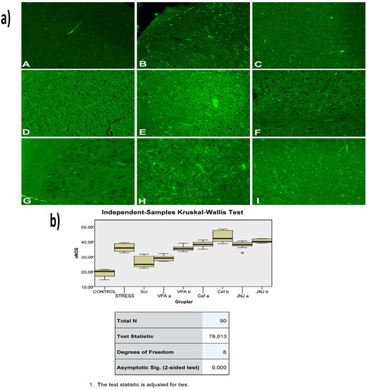 The histopathological evaluation of brain tissue through H&E staining revealed that in the control group the structure was normal. The exposure to stress caused very severe degeneration in neuron cells, necrosis, and hyperemia in the parenchymal and meningeal vessels in the Stress group. The treatment with Ser, VPA and Cef significantly decreased the degeneration of neuron cells, necrosis and hyperemia. The effect was dose-dependent for VPA and Cef, with the highest dose of Cef being similar to Ser. The treatment with the H4 receptor antagonist JNJ also decreased the histopathological changes produced by the exposure to stressful stimuli (Figure 6). The evaluation of immunohistochemical expression of 8-OHdG (Figure 7) and GFAP (Figure 8), and immunofluorescence of nNOS (Figure 9) in the brain tissue revealed that in the Stress group an up-regulation of these markers and the administration of known antidepressant drugs decreased 8-OHdG (Figure 7), nNOS (Figure 9) and, GFAP (Figure 8) immune-expression in the Stress group, the effects the being dose-dependent. In terms of GFAP expression, there was a decrease in the VPA b and JNJ b groups compared to the stress group, but this decrease was not statistically significant (Figure 8). Compared to the stress group, 8-OHdG immunoreactivity showed a statistically significant decrease in the Scr, JNJ b, Cef a, Cef b, VPA a and VPA b groups, except for the JNJ a group (p < 0.05) (Figure 7). nNOS expression was evaluated by the immunofluorescence staining method. Although there was a decrease in the immunoreactivity density in the other groups compared to the stress group, no statistically significant difference was observed (Figure 9).