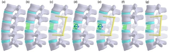The models used in this study. (a) Intact lumbar spine, (b) L3 body height completely restored with bone cement (CC), (c) bone cement along with PI (CCPI), (d) bone cement along with SpineJack (CCSJ), (e) bone cement along with SpineJack and PI (CCSJPI), (f) L3 incompletely restored with bone cement (ICC), and (g) bone cement along with PI (ICCPI).