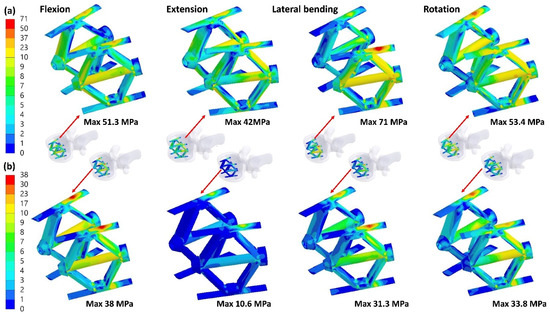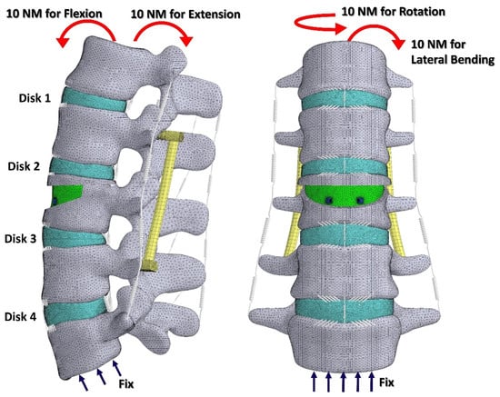 To confirm the reliability of the present FE model, a 10 Nm pure moment in four different directions (flexion, extension, lateral bending, and axial rotation) was applied to the intact lumbar FE model. The total ROMs around the major principal axis were compared with those in the published FE models and cadaveric tests for validation [20,21,22]. Furthermore, the intradiscal pressure of the disks and the force on the facet joints were compared with those in the published FE models under identical loading conditions [23]. Additionally, the results of normalized ROMs of the CC and CCPI were compared with those in the literature [24] to validate the present model with kyphoplasty. The mesh density of the CCSJPI was also globally increased for the convergence test. The number of nodes increased from 2,676,568 to 14,333,320, and the peak equivalent stress (also called von Mises stress) of the SpineJack and PI in 400 N axial compression were used as indices for the convergence test. After the validation and convergence test, the physiological load of a 400 N vertical force was applied to the superior surface of L1 in the first step [25], and then a 10 Nm pure moment in four different directions, namely flexion, extension, lateral bending, and axial rotation (Figure 3), was applied in the second step [26].