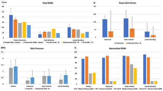The results of validation of total ROMs, facet joint force and peak disk stress (median, maximum, and minimum of the four disks), and normalized ROM with bone cement and SpineJack.