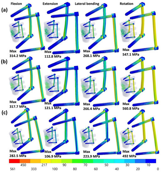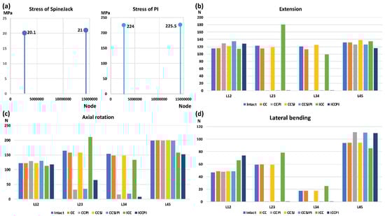 The highest equivalent stress of the SpineJack occurred in lateral bending without the PI, but in flexion with the PI (Figure 10). The peak stress of the SpineJack decreased by 46.5% (from 71 to 38 MPa) after using the PI. The highest equivalent stress of the PI was revealed in axial rotation without the SpineJack (ICPI), whereas the lowest stress occurred in extension with incomplete body height restoration (ICC). The peak stress of the PI in the ICC were 317.7, 121.1, 266.4, and 560.8 MPa in flexion, extension, lateral bending, and axial rotation, respectively (Figure 11).