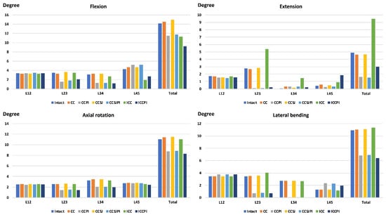 The total ROM of the ICC increased in extension but decreased in flexion compared with that of the intact lumbar region (Figure 6), whereas the summation of the total ROM in flexion and extension was similar in the ICC (20.8°) and intact (19°) lumbar regions. Furthermore, the total ROMs of the CC and CCSJ were similar to those of the intact lumbar spine. The use of PI with bone cement or bone cement together with the SpineJack was expected to reduce the ROM at the levels with the PI but increase the ROM below the PI. The ROMs of disk 4 in lateral bending increased by 83%, 82%, and 53% in the CCPI, CCSJPI, and ICCPI, respectively, when compared with that of the intact lumbar.