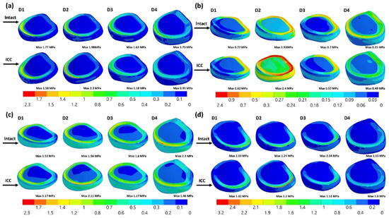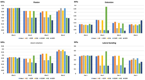 The equivalent stress of the disks in the ICC and intact lumber in flexion (a), extension (b), axial rotation (c), and lateral bending (d).