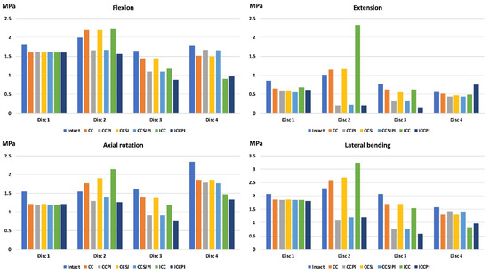 The equivalent stress of disk 2, both the annular ground substance and the nucleus, in the ICC was much higher than that of the intact lumbar spine in extension and lateral bending (Figure 7, Figure 8 and Figure 9). The peak stress of disk 2 in the ICC increased by 154% (from 0.93 to 2.37 MPa) and 116% (from 0.18 to 0.39 MPa), respectively, in the annular ground substance and nucleus when compared with the intact one. Using the PI could protect the disk and drastically reduce the disk stress. The peak stress of the disk 2 nucleus in extension was reduced by 77%, 77.2%, and 78.9% in the CCPI, CCSJPI, and ICPI, respectively, when compared with that in the intact lumbar region.
