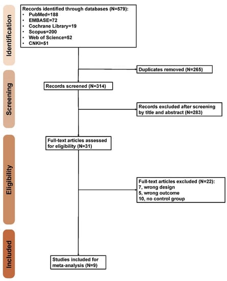 The present study identified 579 records in the preliminary search. After removing duplicates and screening titles and abstracts, 31 studies eventually underwent full-text review. Twenty-two studies were excluded due to a lack of comparison to the control group (N = 10), an inappropriate study design (N = 7) or an inappropriate outcome (N = 5). As a result, 9 eligible studies were included (Figure 1).