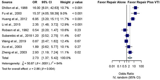 Eleven studies compared the OME-free rate among included patients between palatal repair with and without VTI [29,30,31,32,33,34,35,36,37,38,39]. Overall, the pooled result revealed a significantly higher OME-free rate after palatal repair plus VTI than after palatal repair alone (OR, 2.73; 95% CI, 1.37 to 5.42; p = 0.004; I2 = 84%) (Figure 2).