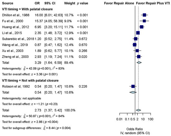 Subgroup analysis was performed according to the timing of VTI. Nine included studies [29,30,31,32,33,34,35,36,38] enrolled patients who underwent concurrent VTI with palatal repair, and the pooled result showed a significantly higher OME-free rate in these patients than in patients undergoing palatal repair without VTI (OR, 3.29; 95% CI, 1.64 to 6.59; p < 0.001; I2 = 81%). Another one included studies enrolled patients who underwent VTI after palatal repair [29] and the result showed no significant difference between the intervention and control groups (OR, 0.54; 95% CI, 0.20 to 1.47; p = 0.226) (Figure 3).