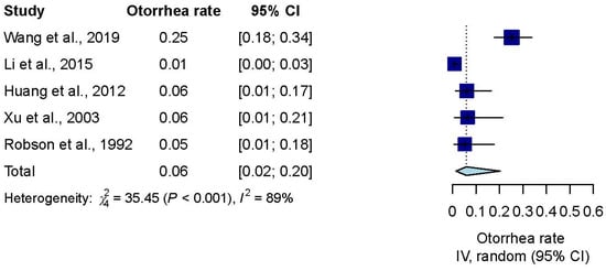 Five studies [29,30,31,33,37] that reported post-VTI otorrhea data were pooled for effect estimation. The pooled otorrhea rate was 6% (rate, 0.06; 95% CI, 0.02–0.2; I2 = 89%) (Figure 4).