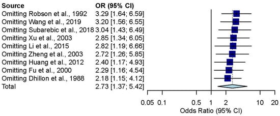 - Higgins, J.P.; Thompson, S.G.; Deeks, J.J.; Altman, D.G. Measuring inconsistency in meta-analyses. Bmj 2003, 327, 557–560. [Google Scholar] [CrossRef] [PubMed]