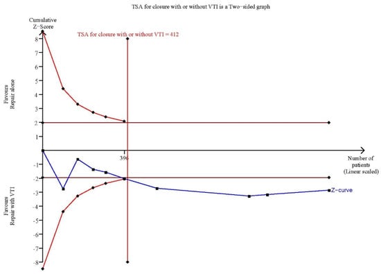 Issues regarding VTI in patients with cleft palate have been discussed for decades [10,36,38,39]. In a previous review [10] of patients with cleft palate, the efficacy of palatal repair with VTI was greater than that of palatal repair without VTI, as the rate of OME development was 15% to 20% for palatal repair with VTI and 56% to 80% for palatal repair without VTI. However, no quantitative evidence is currently available. Therefore, we systematically examined all relevant studies and obtained quantitative results via meta-analysis. Subsequent TSA further supported the reliability of the results. To our knowledge, this is the first meta-analysis to provide quantitative evidence on the efficacy of VTI with palatal repair in patients with cleft palate.