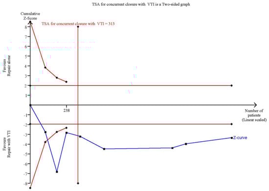 The cumulative Z-curves surpassed both the traditional significance boundary and the sequential monitoring boundaries for the adjusted significance threshold in favor of palatal repair with VTI after the required information size (RIS) was reached in the TSA of the overall analysis (Figure 6) and the subgroup analysis of concurrent VTI with palatal repair (Figure 7). Consequently, the TSAs indicated conclusive results for these outcomes.