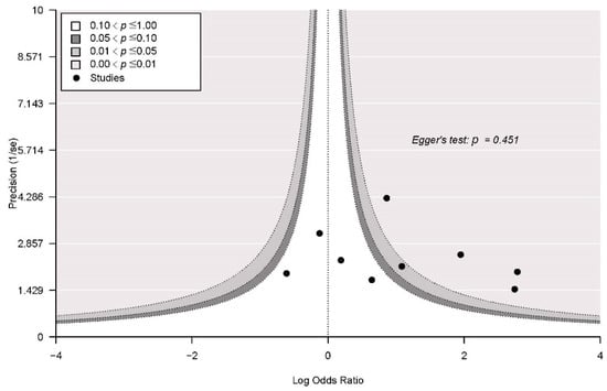Publication bias was assessed for the overall results with contour-enhanced funnel plots. Egger’s test revealed no significant asymmetry in either outcome (p = 0.466) for the overall assessment (Figure 8).