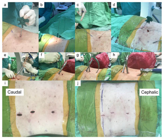 (a) The entry point of the pedicle screw is determined using a Jamshidi needle under fluoroscopic guidance. (b) The Jamshidi needle is inserted into the pedicle, and a blunt guide wire is inserted through the Jamshidi needle. (c) The direction of iliac screw is determined with a Steimann pin under fluoroscopic guidance and a guiding line is drawn on the skin. (d) The Jamshidi needle is docked into the recess below the posterior iliac spine following the guiding line at 45° in the ventral and caudal directions toward the anterior inferior iliac spine. The blunt guiding pin is placed through the Jamshidi needle. (e) The cannulated iliac screw is inserted. (f) The L5 pedicle screw is inserted. (g,h) The Sextant II percutaneous rod system is used to deliver the rod percutaneously. (i,j) The surgical wound of the minimally invasive technique.