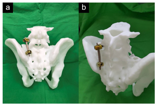 Minimally invasive spinopelvic fixator in three-dimensional printing model. (a) Posterior view of the spinopelvic fixator. (b) Oblique view of the spinopelvic fixator and the entry point of iliac screw located at the recess below the posterior iliac spine. The screw head can hide under the bony prominence. This 1:1 3D printing bone model is supported by the Medial 3D Printing Center, Tri-Service General Hospital, National Defense Medical Center, Taipei, Taiwan.
