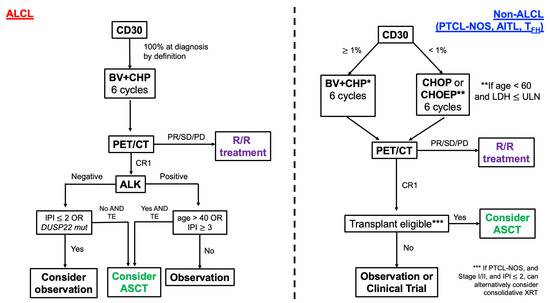 The role of consolidative stem cell transplantation as standard of care in fit patients with PTCL has come into question based on two recent analyses. Early ASCT following first remission has been historically associated with improved PFS (but not OS) for those with diffuse, aggressive, and high-intermediate or high risk NHL based on the results of the SWOG 9704 intergroup trial. Notably, this analysis combined both aggressive B- and T-cell lymphomas, with only 40 of 370 induction-eligible patients harboring an aggressive T-cell phenotype [75]. Furthermore, 30% of these patients were excluded from the study prior to randomization. A retrospective, subgroup analysis of T-NHL from SWOG 9704 compared outcomes of the 15 patients that continued to ASCT versus the 13 patients that were randomized to the control group, consisting of three additional cycles of chemoimmunotherapy without ASCT. While sample sizes were small, intriguingly there were no statistically significant differences in outcome (5-year PFS: 40% vs. 38% for ASCT vs. control, respectively; OS: 40% vs. 45% for ASCT vs. control, respectively) [76]. This was followed by a randomized, phase III clinical study directly comparing ASCT and alloSCT in 104 transplant-eligible patients with PTCL (except ALK-positive ALCL) following CR with four cycles of CHOEP induction chemotherapy. Interestingly, there were no statistically significant differences in 3-year EFS (43% vs. 38%) or OS (57% vs. 70%) between alloSCT and ASCT. In fact, in the alloSCT arm, none of the patients experienced disease relapse; however, eight patients (31%) ultimately died from treatment-related mortality, closing the study. Collectively, these data suggest no current role for alloSCT in consolidating a first remission of nodal PTCL, although it is strongly considered for certain highly aggressive and rare non-nodal TCL subtypes, such as hepatosplenic T-cell lymphoma (HSTCL) and ATLL. While the role of ASCT is still debatable, our current practice is to offer ASCT in transplant-eligible patients (1) with non-ALCL treated with BV + CHP or CHO(E)P, (2) with high-risk IPI ALK-negative ALCL, or (3) who are older and who have ALK-positive ALCL, based on outcome data according to prognostic scoring and genetic subtype (Figure 1) [77,78]. As an example, in considering specific molecular features, DUSP22-rearranged ALCL has been shown to have excellent prognosis, similar to ALK-positive ALCL, possibly rendering ASCT unnecessary, although this will have to be confirmed in larger series [79].
