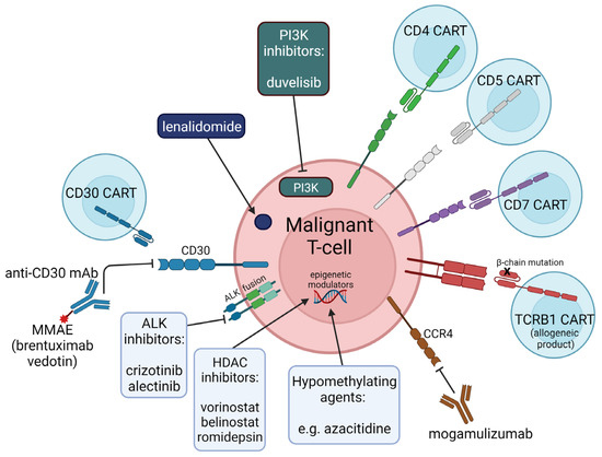 Schematic of novel biologic agents currently employed and potential future cellular therapies under development for clinical use against peripheral T-cell lymphomas. CAR = Chimeric antigen receptor, CART = CAR-T cell, MMAE = monomethyl auristatin E, HDAC = histone deacetylase, PI3K = phosphoinositide 3-kinase, TCRB1 = T-cell receptor beta chain 1, CCR4 = CC chemokine receptor 4.