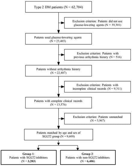 This retrospective study included patients with type 2 DM and indicated glucose-lowering agents from medical records from Kaohsiung Medical University Hospital from 2016 to 2019. Patients who did not use glucose-lowering agents, had an age of less than 18 years, and those with uncontrolled hypertension were excluded (blood pressure >140/90 mmHg). Included patients were taking glucose-lowering agents for at least 3 months. In addition, patients with a history of arrhythmia and anti-arrhythmic medication use were also excluded. Patients with cardiac arrhythmia were defined by International Classification of Diseases (ICD) 9/10 coding in medical records, which includes atrial and ventricular arrhythmia. The anti-arrhythmic medication included dronedarone, propafenone, amiodarone, flecainide, and mexiletine. The characteristics of the included patients were collected for univariate and multivariate analysis by medical records. The included patients were divided into 2 groups. Group 1 was defined as patients receiving SGLT2 inhibitor therapy, and group 2 was defined as patients not receiving SGLT2 inhibitor therapy. After collecting the baseline characteristics, the association and difference in SGLT2 inhibitor therapy and cardiac arrhythmia between the two groups were investigated. This study was approved by the Institutional Review Board of Kaohsiung Medical University Hospital (KMUHIRB-E(II)-20180143).