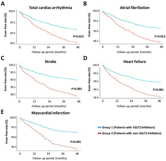 Kaplan–Meier plots demonstrated the time-to-event incidence of the primary and secondary study outcomes, including (A) total arrhythmia, (B) atrial fibrillation, (C) stroke, (D) heart failure, and (E) myocardial infarction. A significantly lower risk of cardiac arrhythmia and related cardiovascular disease was found in group 1 patients than in group 2 patients. All time-to-event incidence curves were generated after the multivariate Cox regression analysis.