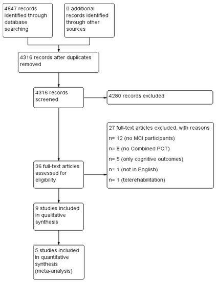 After full-text screening, 27 articles were excluded. Twelve of them were excluded due to the inclusion of non-MCI participants, for eight studies the intervention was not defined as combined PCT, and five of them were not included because only cognitive outcomes were assessed. One study was excluded due to the use of the Spanish language, and another one was excluded due to different kind of intervention provided (i.e., telerehabilitation program) (Figure 1).