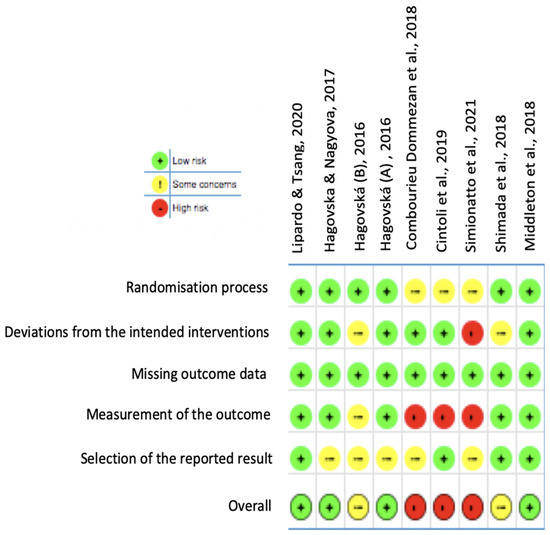 - Selection of the reporting result (reporting bias): The studies by Hagovska and Nagyova, Hagovská (B), Hagovská (A), Combourieu Donnezan et al. and Simionatto et al. were evaluated to have some concerns, whereas the four remaining studies were assessed to have a low risk of bias.
