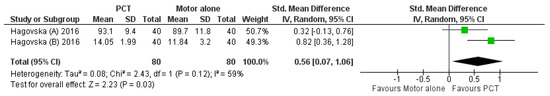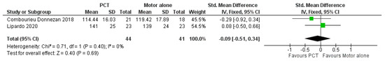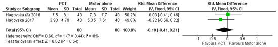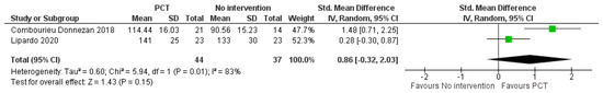 Data from two studies [37,41] were obtained and analyzed for the comparison between combined PCT and no intervention, and they were assessed for the outcomes on mobility and gait speed. The overall number of participants included in the analyses was 81.