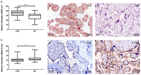 Levels of mRNA for ILK (A) and E-Cad (D) quantified by RT-qPCR, and histological imágenes for immunohistochemical techniques in the placental villi in of women with CVD during pregnancy and HC for ILK (B,C) and E-Cad (E,F). CVD = Chronic venous disease, HC = Healthy control. p < 0.01 (**), and p < 0.001 (***).