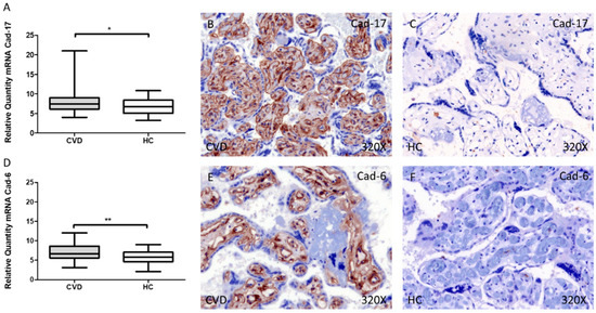 Levels of mRNA for Cad-17 (A) and Cad-6 (D) quantified by RT-qPCR, and histological imágenes for immunohistochemical techniques in the placental villi in of women with CVD during pregnancy and HC for Cad-17 (B,C) and Cad-6 (E,F). CVD = Chronic venous disease, HC = Healthy control. p < 0.05 (*), p < 0.01 (**).