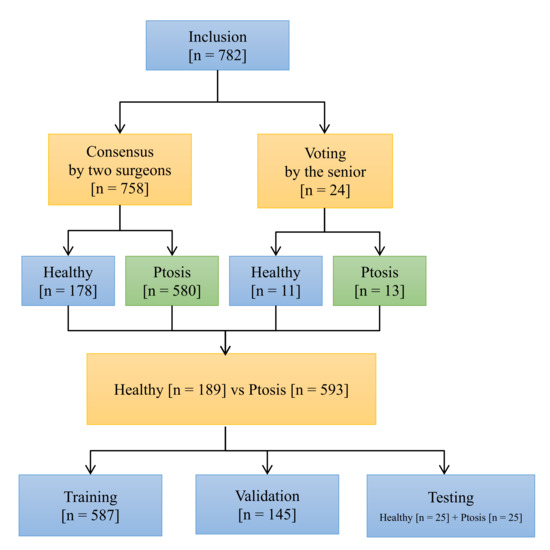 Two labelers, both oculoplastic surgeons, achieved an 82% consensus rate in discussion meetings. The major reasons for their disagreements were decisions about healthy eyelids and mild ptosis. To lessen spectrum bias, a third senior oculoplastic surgeon, as an arbiter, yielded the decisive answer for these disagreements, which included 24 images. Figure 2 shows the voting system, with 593 images (accounting for 75%) in the referable ptosis group and 189 (25%) images in the healthy group.