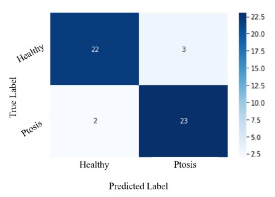 There were 45 correct predictions, including 22 healthy and 23 ptosis answers, by the CNN model from a total of 50 testing images. The accuracy of the AI model was 90%, with a sensitivity of 92% and a specificity of 88%. Three false positives and two false negatives were found.