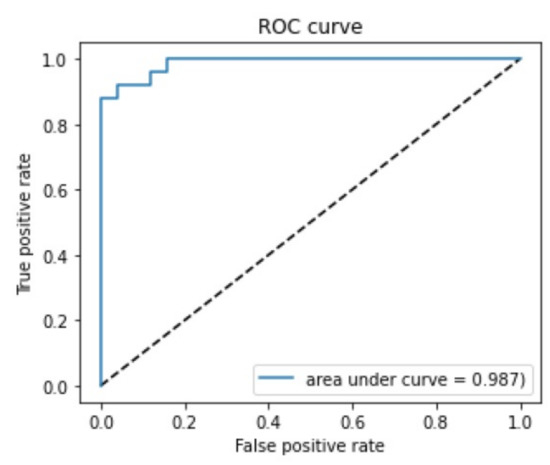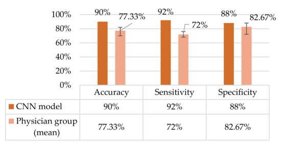 The confusion matrix with a 0.5 threshold setting is shown in Figure 3. The receiver operating characteristic (ROC) curve is presented in Figure 4. The area under the curve (AUC) was 0.987. The mean accuracy of the non-ophthalmic physician group was 77.33% (range: 70–82%) with a mean sensitivity of 72% (range: 68–76%) and a mean specificity of 82.67% (range: 72–88%), as seen in Figure 5.