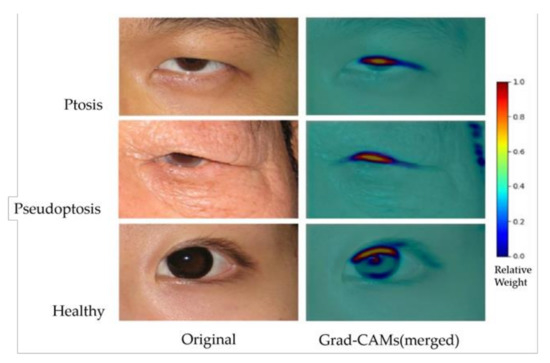 Gradient-weighted class activation mapping (Grad-CAM) [23] was applied to visualize the AI model. The result showed that the weight in the background was around 0~0.2. In the ptotic eyelids, the area between the upper eyelid margin and the central cornea light reflex showed the highest weight, around 0.5~1.0 (Figure 6).