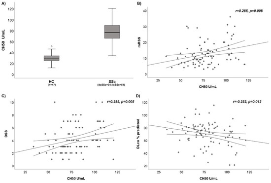 Our goal, however, was to conduct a pilot study in SSc patients showing that CH50 and serum C2 levels are increased in comparison to HC, and that CH50 may represent a biomarker of disease severity and of skin and lung fibrosis. Further studies are needed to evaluate the role of these preliminary data and to prospectively assess the predictive value of complement activity in disease progression. Proposed biomarkers and their employment in new integrated specific panels for autoimmune diseases represent a challenge for clinical and laboratory investigations.