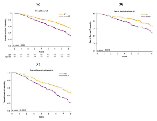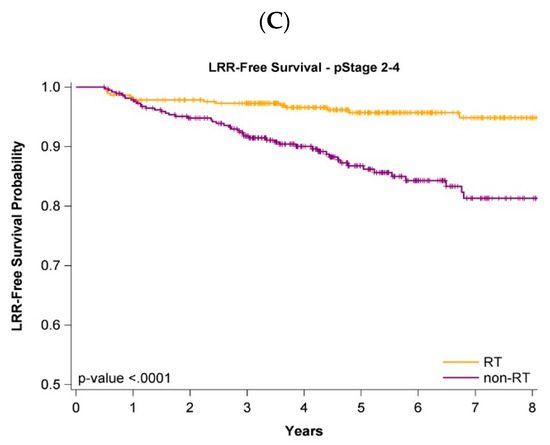 Analysis of the impact of stage (early stage (stage 0-I) or advanced stage (stage II-III)) on oncologic outcomes (OS, LRR, and DM) was conducted with stratification by pathologic stages. The OS, LRR-free, and DM-free survival curves of the adjuvant WBRT group remained significantly superior to those of the nonadjuvant WBRT group regardless of stage (Figure 1B,C, Figure 2B,C and Figure 3B,C). Age stratification by 80–89 and ≥90 years was also performed. The OS, LRR-free, and DM-free survival curves of the adjuvant WBRT group were significantly superior to those of the non-adjuvant WBRT group in both stratifications (Supplementary Figures S1 and S2).