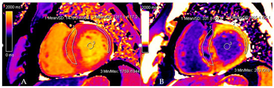 - Messroghli, D.R.; Moon, J.C.; Ferreira, V.M.; Grosse-Wortmann, L.; He, T.; Kellman, P.; Mascherbauer, J.; Nezafat, R.; Salerno, M.; Schelbert, E.B.; et al. Clinical Recommendations for Cardiovascular Magnetic Resonance Mapping of T1, T2, T2 and Extracellular Volume: A Consensus Statement by the Society for Cardiovascular Magnetic Resonance (SCMR) Endorsed by the European Association for Cardiovascular Imagin. J. Cardiovasc. Magn. Reson. 2017, 19, 75. [Google Scholar] [CrossRef] [PubMed] [Green Version]