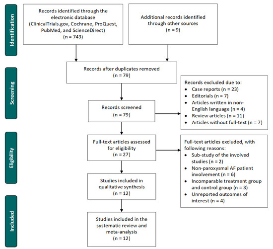 When conducting this systematic review and meta-analysis, the Preferred Reporting Items for Systematic Reviews and Meta-Analyses (PRISMA) statement was followed [25]. Relevant articles comparing 2G-CB ablation with RF-CF ablation for paroxysmal AF recorded in scientific electronic databases such as ClinicalTrials.gov, Cochrane, ProQuest, PubMed, and ScienceDirect were collected and identified according to the eligibility criteria until 31 January 2021. The following keywords were used to find relevant articles: “ablation” or “catheter ablation,” AND “pulmonary vein isolation” or “PVI,” AND “second-generation cryoballoon” or “2nd generation cryoballoon,” AND “contact force radiofrequency,” or “contact force-sensing radiofrequency,” AND “paroxysmal atrial fibrillation” or “paroxysmal AF.” We also gathered and identified potentially relevant papers from the reference lists of the examined articles. Table S1 summarizes the detailed search strategy. The titles, abstracts, and keywords of the identified records were reviewed. Following that, the full texts of all eligible records were examined.