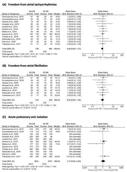Forest plot of (A) freedom from atrial tachyarrhythmias; (B) freedom from atrial fibrillation; and (C) acute pulmonary vein isolation. 2G-CB = second-generation cryoballoon; CF-RF = contact force-sensing radiofrequency; CI =confidence interval; M–H = Mantel–Haenszel.