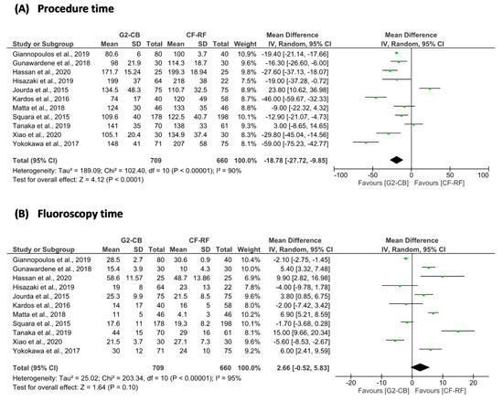 Forest plot of (A) procedure time and (B) fluoroscopy time; 2G-CB = second-generation cryoballoon; CF-RF = contact force-sensing radiofrequency; CI = confidence interval; IV = inverse variance; SD = standard deviation.