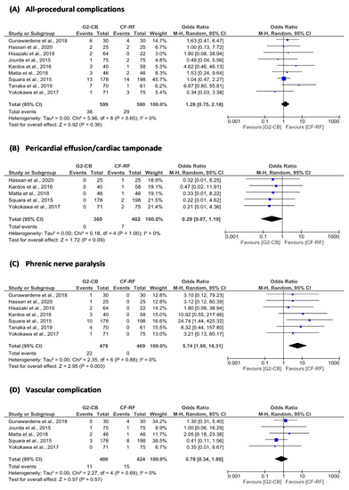 Forest plot of (A) all-procedural complications; (B) pericardial effusion/cardiac tamponade; (C) phrenic nerve paralysis; and (D) vascular complications. 2G-CB = second-generation cryoballoon ablation; CF-RF = contact force-sensing radiofrequency ablation; CI = confidence interval; M–H = Mantel–Haenszel.