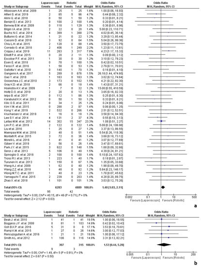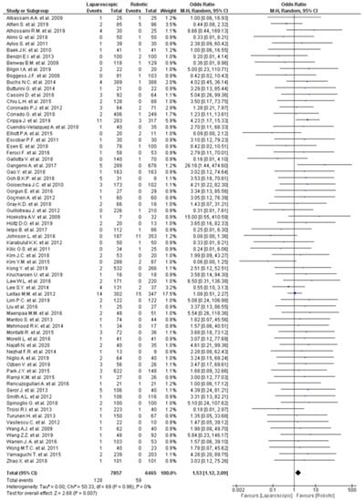 Seventy studies provided data about the conversion to open surgery due to anastomotic adhesions [13,25,26,27,28,29,30,31,32,33,34,35,36,37,38,39,40,41,42,43,44,45,46,47,48,49,50,51,52,53,54,55,56,57,58,59,60,61,62,63,64,65,66,67,68,69,70,71,72,73,74,75,76,77,78,79,80,81,82,83,84,85,86,87,88,89,90,91,92,93], even if only nine of them [13,35,41,43,45,46,50,78,84] reported the definition of conversion. The robotic approach was associated with a reduced risk of conversion (OR 1.53, 95% CI 1.12–2.10, p = 0.007, Figure 1), with consistent results across all the 70 studies since no heterogeneity was observed (I2 = 0%, p = 0.95).