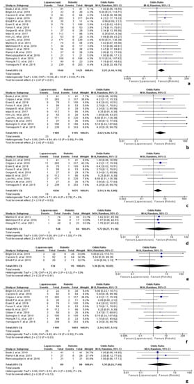 The results of the studies about colorectal surgery are shown in Figure 3. Nineteen studies [30,33,37,41,43,45,46,52,57,61,65,71,72,78,80,81,84,91,92] included in the final analysis were including colorectal surgery cases and involved 2969 procedures, of which 1548 laparoscopic and 1421 robotic. Of the included studies, eleven were on colorectal cancer [30,41,45,46,52,57,61,65,80,84,92], three on rectocele or rectal prolapse [71,72,91] and three on diverticular disease patients [33,37,43]. Ozben et al. [78] described surgical procedures related to both benign and malign diseases. Rencuzogullari et al. [81] was the only one to report surgical proctectomy performed for IBD, so it was excluded from the subgroup analysis.