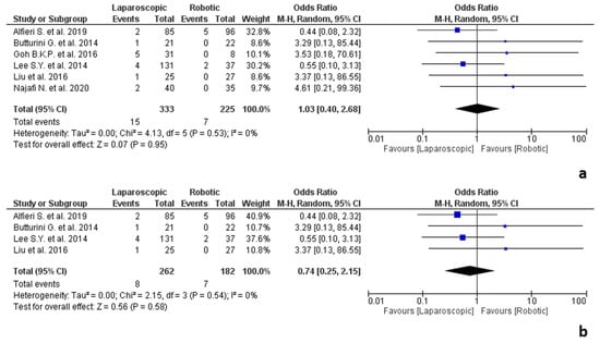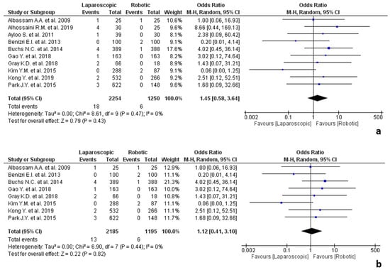 No statistically significant differences in terms of conversion rate due to adhesions were observed between robotics and laparoscopy in the studies about rectocele/rectal prolapse [72,73,91] and diverticular disease [33,37,43] (OR 1.72, 95% CI 0.27–11.16, p = 0.57 and OR 1.36, 95% CI 0.10–18.02, p = 0.81, respectively), with no significant heterogeneity among the studies (I2 = 0%, p = 1.00 and I2 = 53%, p = 0.12, respectively).