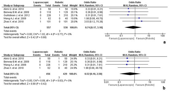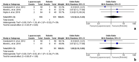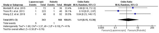 The results of the endocrine surgery studies are shown in Figure 9. Three studies [59,74,77] that addressed adrenalectomies for adrenal cancer were included in the analysis, involving 286 procedures, 155 laparoscopic and 131 robotic.