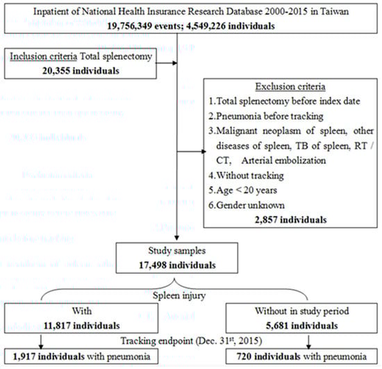 This was a retrospective cohort study. To create the case cohort, patients who underwent total splenectomy (International Classification of Diseases, Ninth Revision, Clinical Modification, ICD-9 procedure code 41.5) between 2000 and 2015 were identified and extracted from the health insurance database. We included patients who underwent total splenectomy between 2000 and 2015. We excluded those with total splenectomy before the index date, pneumonia before tracking, malignant neoplasm of the spleen, tuberculosis of the spleen, those who underwent radiography or chemotherapy, those aged less than 20 years, and those with unknown sex. Finally, we identified 17,498 patients who met the inclusion criteria. Patient information was reviewed chronologically until a diagnosis of pneumonia was made, or until 31 December 2015. The flowchart of study sample selection and design is detailed in Figure 1.