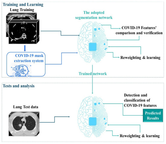 In the context of segmentation of infections and lesions, very promising deep learning systems have been suggested for medical image analysis [32,33,34,35,36,37]. Mostly, this work is dedicated to segmenting the lungs and the classification of regions of infection to support clinical evaluation and diagnosis [38]. In the case of COVID-19, segmentation allows delineating regions of interest in lung images for further evaluation. Wang et al. suggested a weakly supervised deep learning software system that uses CT images for the detection of COVID-19 [39]. Gozes et al. presented a system that studies 2D slices to analyze 3D volumes [40]. Wang et al. presented a rapid diagnostic system for COVID-19, based on segmentation for the localization of lung lesions and then classification to determine the lesion analogy [41]. Li et al. introduced a COVNet to obtain visual information from volumetric chest CT scans to distinguish community-acquired pneumonia (CAP) from COVID-19 [42]. Chen et al. proposed the use of the U-Net++ network for extraction of COVID-19 affected areas and detection of suspicious lesions on CT images [43]. Akram et al. [44], to extract the relevant features, used discrete wavelet transform and extended segmentation-based fractal texture analysis methods followed by an entropy-controlled genetic algorithm to select the best features from each feature type, which were then combined serially.