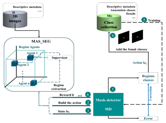 - A supervisor agent, which incorporates a neural network to manage the interactions of the MAS agents and subsequently participates in the learning of the mask detector.