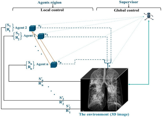 The preparation of the regions is performed by MAS_SEG, and this system is based on two techniques, the principles of RL learning and a nonstationary policy to produce a cooperative segmentation. Often, RL methods guarantee the learning of the optimal behavior of an agent based on a reward obtained from its environment. Most of the works in RL learning consider that the agent has only one goal to maximize. However, in the case of agents in MAS_SEG, each agent must perform many sequential decision tasks, which reveals multiple conflicting goals. For example, in the 3D segmentation task, merging regions is a competitive task, which requires reducing conflicts of interest and increasing the detection of regions satisfying similarity criteria, achieving optimal system stability, and considering interaction time and the lightness of merging in a cooperative and efficient context. To this end, the agents in MAS_SEG illustrated in Figure 3 admit a policy that best fits a predefined trade-off between objectives.